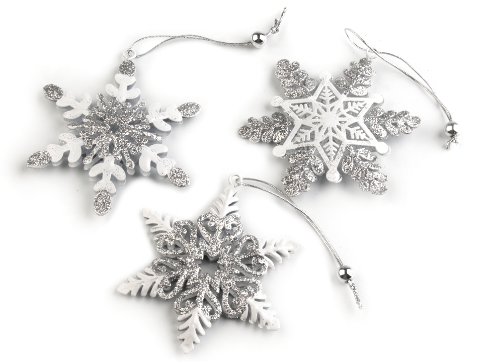 Kovová dekorácia, zobrazujúca snehové vločky, je ozdobená glitrami, ktoré sa pekne trblietajú. Dekoráciu môžete pomocou očka a šnúrky zavesiť na stromček, dvere, do okien alebo volne do priestoru. Vločky sú zabalené v plastovej krabičke.
