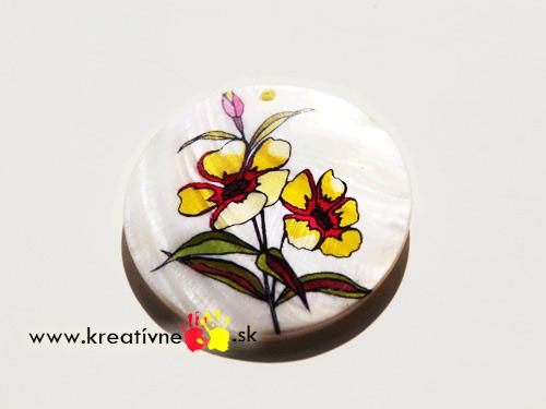 Placičky majú priemer 5 cm a krásne na ních vyniká povrchová štruktúra, ktorá je pre prírodnú perleť typická. Na placičke je zobrazená žltá fialka. Možnosť využitia ako prívesok.