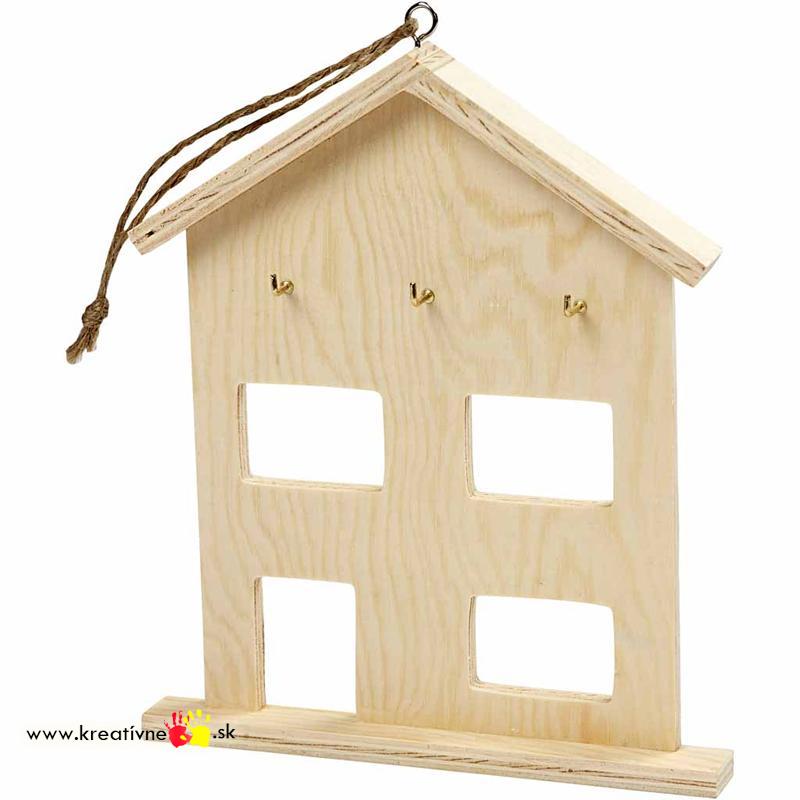 Drevený vešiak na kľúč v tvare domčeka s okienkami a dverami. Na domčeku sa nachádzajú 3 háčiky na kľúče.