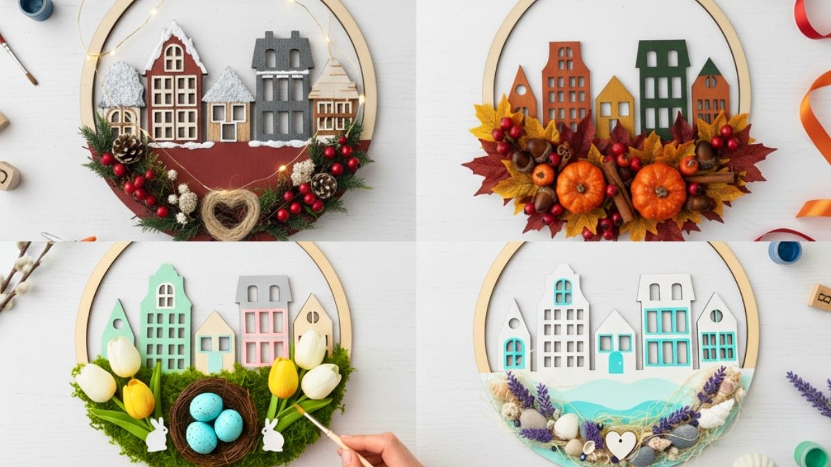 Drevený veniec s domčekmi 27,3x27,3 cm, 1 ks